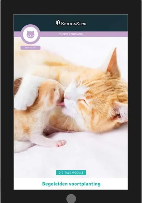 De digitale module Begeleiden voortplanting* behandelt hoe je als dierverzorger de voortplanting van diverse zoogdieren, vogels, vissen, amfibieën en reptielen in goede banen kunt leiden. De digitale module bestaat uit vier hoofdstukken die samen het begeleiden van de voortplanting bij meerdere diersoorten behandelen. Zo komen onderwerpen als paring en dekking, het vaststellen en begeleiden van de dracht en broed, het geboorte- en uitkomstproces en het opfokken van jonge dieren aan de orde.